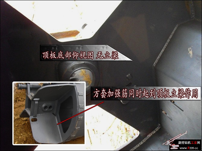 铸造方套:宝峨钻斗方套上部围绕加强筋和销孔加厚处无焊缝,同时表面的粗造程度和方套底部的形状,可以证明宝峨方套是一体铸造成型的,而不是常规的铁板拼接。其优点:主要体现在方套底部为一体式,可以承载又不需承载梁支撑。 ![]() 顶板底部无支撑梁:由于宝峨方套为一体铸造式,因此宝峨底部可以省略承载立梁。同时宝峨采用顶板加宽,方套加强筋加强顶板的方法,省略的顶板底部支撑梁。 总结:仔细观察宝峨钻具,确实有很多不一样的地方,每个细节之处都有特定的功能,处处彰显德国人的严谨,同时也可看出宝峨非常注重工法,确实值得我们学习仿效。 顶一下